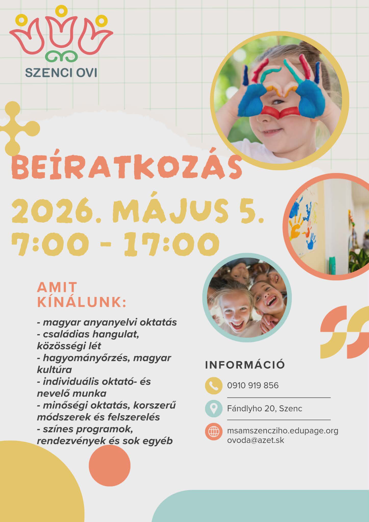 Az óvodai beíratkozásra a 2026/2027-es tanévre 2026. május 5-én kerül sor az óvoda épületében, a gyermek és törvényes képviselői jelenlétében, 7:00 – 17:00 között.